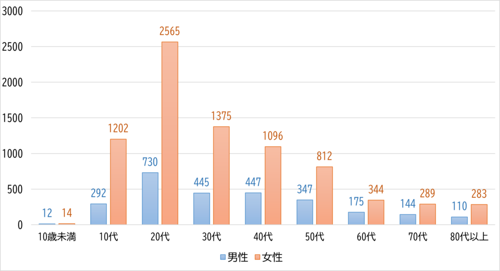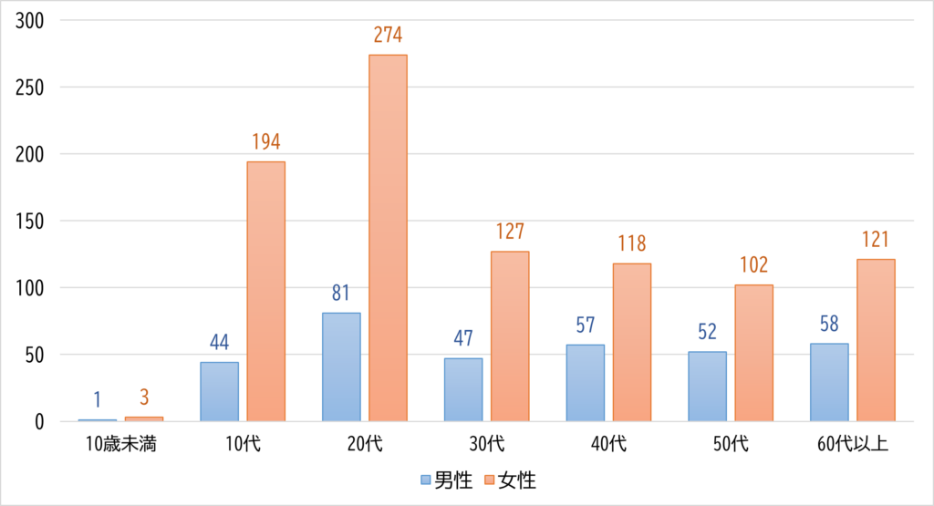 全国では、オーバードーズが原因と疑われる救急搬送者数の約半分を、10代~20代の若い人たちが占めています(図2)。これは、福岡県でも同じ状況です(図3)。