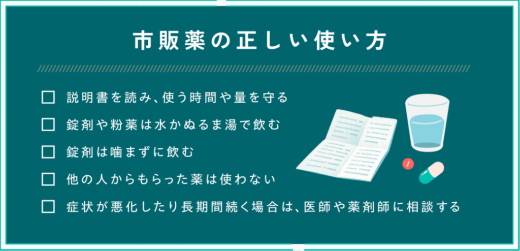 市販薬は、ちょっとした体の不調を感じた時に、自分で手当てができる薬ですが、正しい使い方を守ることが大切です。使い方を誤ると、かえって体に悪い影響を及ぼすことがあります。