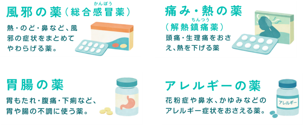 市販薬とは、病院でもらう処方箋がなくても、薬局やドラッグストアで購入できる薬で、軽い症状をケアするために使われます。主に次のような種類があります。